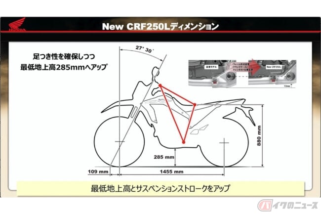 新型モデルでは、オフロード性能を向上させるために、最低地上高を今までの255mmから30mmアップした285mmへ変更し、走破性を向上させました。使い勝手を考慮し、シート高を現行モデルと同等の880mmに抑えつつ対応しています。シートや外装部品の工夫で足つき性は現行モデルと同等です。
