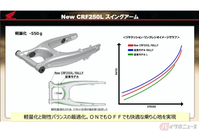 また、製造方法は踏襲しつつも板厚の最適化により550gの軽量化を実現しています。また、リアショックですが、ストローク量を現行もでるより20mm増やした260mmとし、衝撃の吸収を向上しています。さらにリンクレシオの最適化のため、リンクとコンロッドを新設しています。オフロード路面での吸収性向上と、制御感ある快適な乗り心地を両立しています。