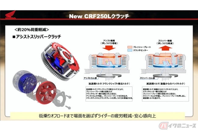 新型CRF250Lではアシストスリッパークラッチを新たに採用し、さらなるレバー荷重低減を図りました。実際には約20%の荷重低減を実現しました。