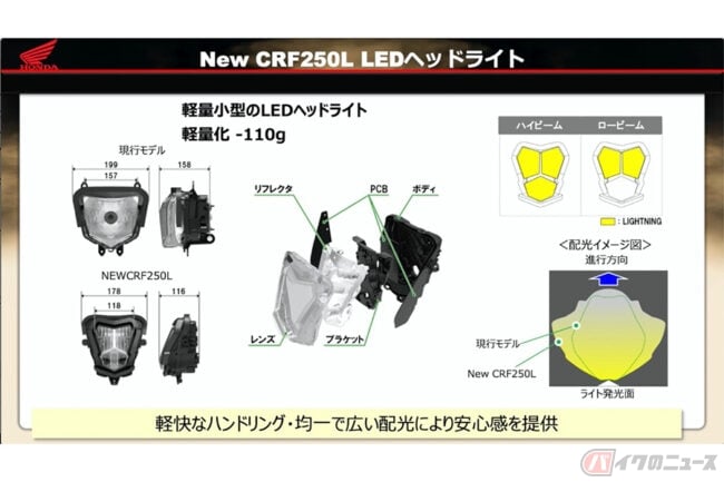 ヘッドライトはオフロードモデルの軽快性を表現するため軽量コンパクトな薄型LEDヘッドライトを採用しました。LEDタイプを採用することにより、現行モデルに対して前後長を約40mm短縮しています。さらに発光基盤をリフレクターの側部に縦置きすることで通常のLEDリフレクターライトに対して発光レンズ幅を抑え、小型化を達成しています。重量ですが現行モデルに対して110g軽量化の610gに押さえています。