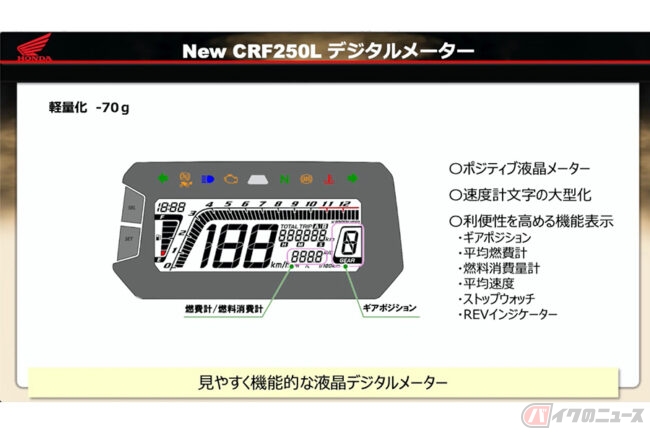 スピードメーターはオフロード走行を想定し見やすさを重視した白背景に黒文字のポジティブ液晶メーターを採用しました。さらに、視認性を高めるために速度計の文字を現行モデルの17mmから23mmへ大型化しています。重量は現行モデルに対して70g軽量化しました。機能面についてはギアポジション、平均燃費計、燃料消費量の情報を追加し、利便性を高めています。