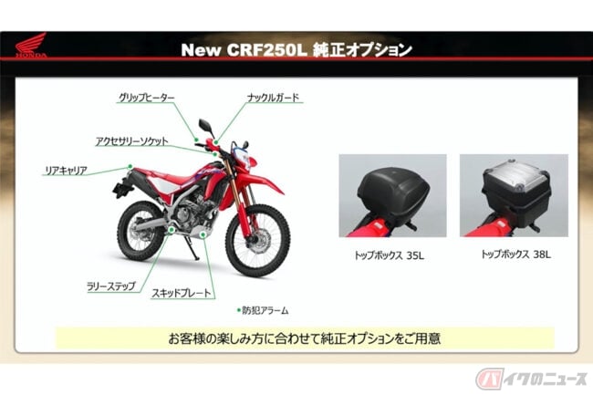 新型CRF250Lではお客様の楽しみ方に合わせて純正オプションを用意しました。CRF250Lでは板厚4mmのスキッドプレート、モトクロッサー譲りのワイドステップを新規設定しています。また、積載用のリアキャリア、トップボックスも追加しています。