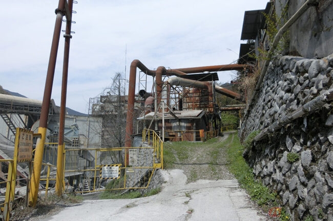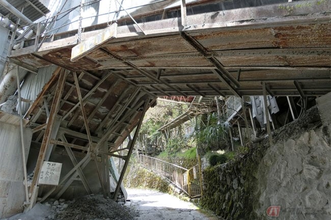 その道からは、まるで廃墟となった化学プラントのように、錆びついた何本ものパイプや、石灰石の粉塵で白くなったベルトコンベアなどが手に取るように見え、あたかも工場の敷地内にいるかのような光景です。