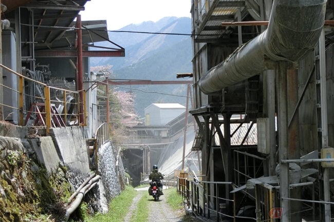 じつはこの工場は、離れた場所から眺めるだけではなく、ほぼ工場の中を通行できるのです。驚いたことに、工場の敷地を貫くように細い公道が通っています。公道なので通行可能、バイクで通ることも出来ます。