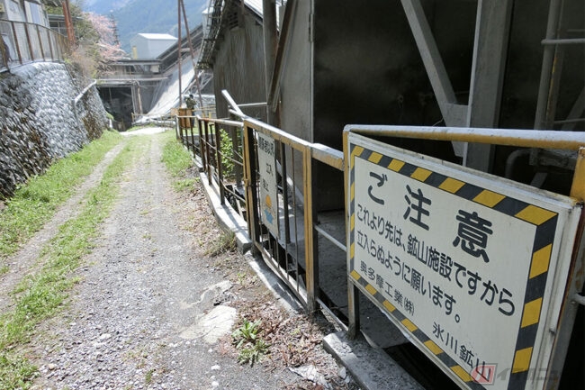 駅の脇にある集落の細い坂を上っていくと、やがて工場が見えてきます。Y字路を左に進むと工場の敷地内へと向かう立ち入り禁止エリアですが、もう一方の細い道が公道となっており、工場の設備をくぐるように奥へと続いています。