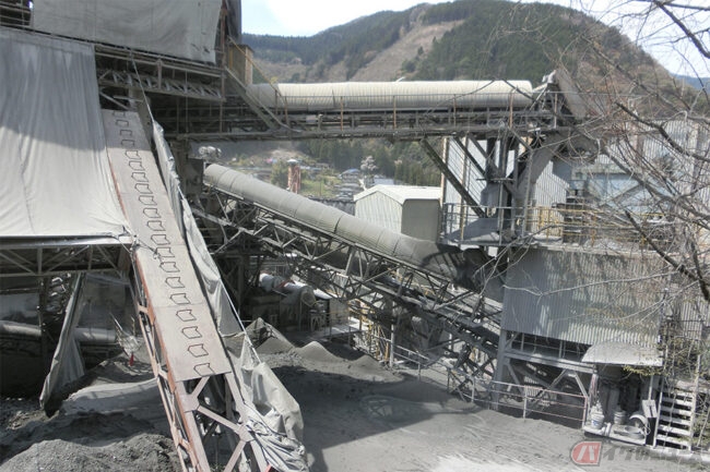 気になってもう少し近づける道を探し、日原川脇の道に下りてみました。あらためて見ると、まるで山中に突然現れた要塞のような大迫力でそそり立っています。何本ものパイプが張り巡らされ、ベルトコンベアのような装置が動く様は、秘密基地のようでもあり、ものすごい存在感を放っています。
