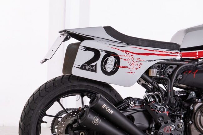 また、シート周りはフラットトラッカーに見られるような形状とし、エキゾーストシステムも同じくフラットトラッカーで定番の2本出しに変更。併せてワイドなハンドルバーを採用することでフラットトラッカーらしい雰囲気が盛り込まれています。