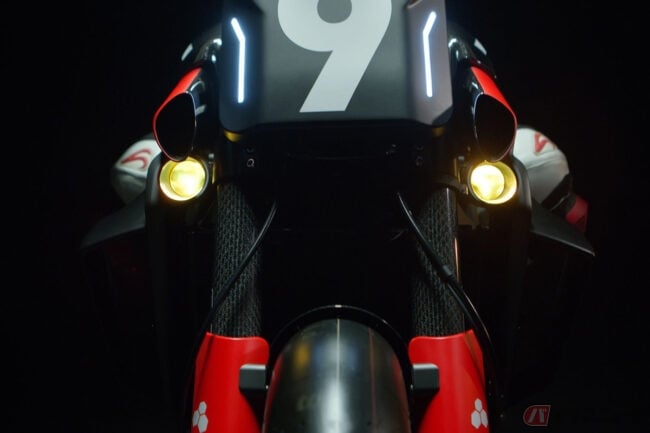 カーボンファイバー製のエアインテーク一体型燃料タンクカバー、シート&テール(アルカンターラ製サドル、テール&シグナルランプを含む)、フロントナンバープレート、一体型デイタイム・ランニング・ライト、ウイングレット付ラジエターカバー、ハイ/ロービームヘッドライト、ナンバープレートホルダー、スプロケットカバーなどの新規製作パーツをフレーム等の加工無しで装着しています。