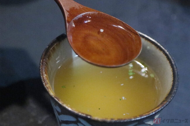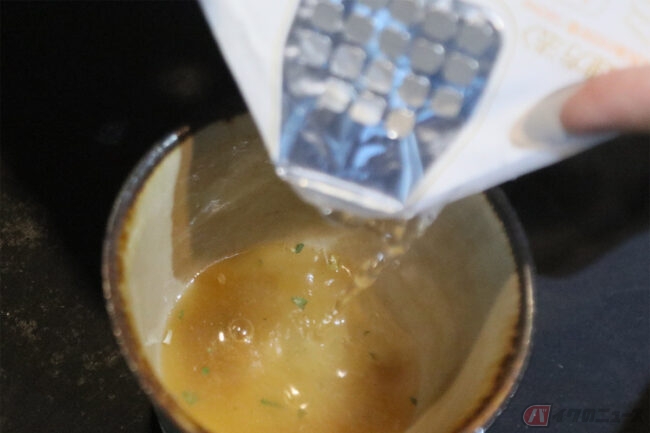 スープを飲んでみましょう。もどし湯に溶け出した麺の成分が絶妙な風味を醸し出すのでしょう。お湯で作るよりも旨味が出ているのは確実。暑い日は塩分補給に良いでしょう。逆に寒い日は体がポカポカします。