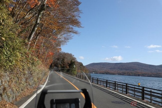 山中湖の湖岸を東西に横断して走る場合、北岸の県道729号と南岸の国道138号から413号という2つのルートが考えられますが、県道729号のほうが交通量や観光施設が少なく緑も多いので、のんびりとツーリングするにはオススメです。北岸を走るということは、山中湖越しに富士山を眺めることができるということでもあります。