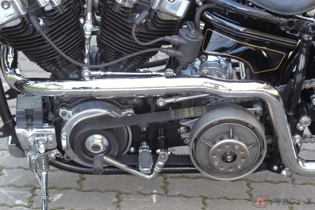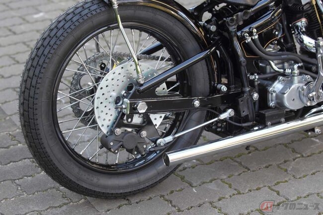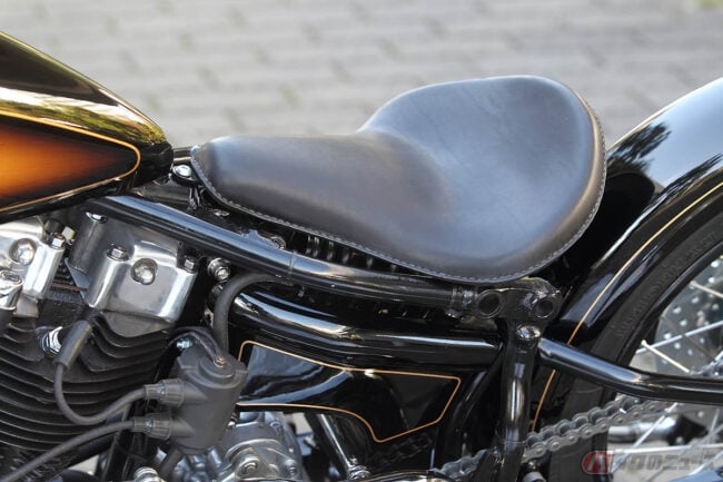 ちなみにこのマシンのベースは1981年式ハーレーダビッドソンFXSローライダーなのですが、その純正フレームを活かしつつリア周りを大胆にモデファイ。純正のスイングアームを使用した上でシート下にサスを装備するカンチレバータイプのソフテイル式となっているのですが、この部分がカスタムの特徴を決定づける大きなポイントになっています。