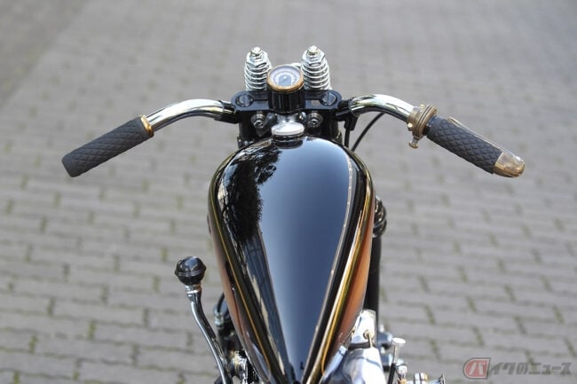 その他、同カスタムバイクではこうしたスタイルのマシンでは珍しい左右2本出しのマフラーや前方から後方にかけてシェイプされたデザインのフューエルタンク、そこに施されたKAMIKAZEピンストライピングによる美しいサンバースト塗装などで個性が演出されているのですが、そこには取って付けたかのような違和感がなく、1台のカスタムとして見事なまとまりを見せています。