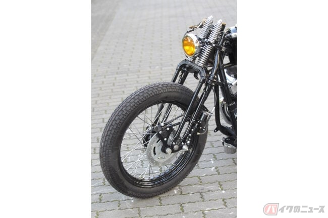 またフロントフォークはV-Twin製のスプリンガーフォークに換装されているのですが、ブレーキレバーから延びるワイヤーをハンドル中通しとした上でリアレッグ部(フロントフォークの構成パーツ)で油圧式に変換する意匠は見事の一言です。
