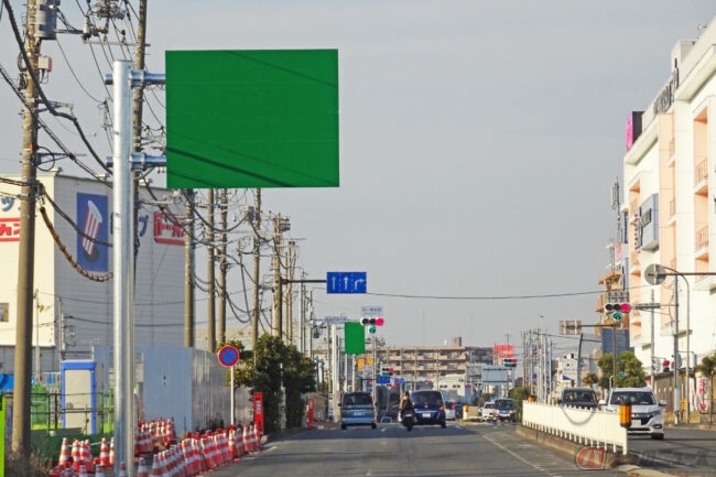 看板は文字情報の入ったものがすでに設置されているものの、同色のシートを張り付けて外見上は無地の看板にしてあります。おそらく開通直前にアンベール、標識看板として機能するのでしょう。