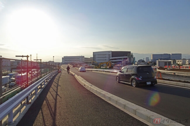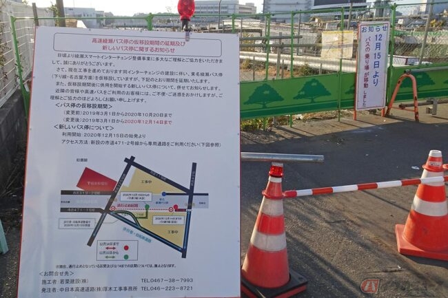 周囲に目を移すと、工事に伴って高速バスの「綾瀬バス停」が仮移設されていたり、高速道路の側道にあたる市道が拡幅されて新しくなっているなど、開通に向けて着々と、さまざまな工事が進んでいるのがわかります。