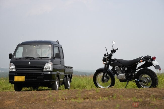 信頼のホンダ「アフリカツイン」で王道を歩むか、シロートお断りのKTM「790アドベンチャーR」で返り討ちにあうか、はたまたエンジンの鼓動が心地いいモトグッツィ「V85 TT」で癒されるか……とあれこれ思い悩んだ結果、スズキ「スーパーキャリイ」(119万3500円/4WD・5MT)と「バンバン200」(40万円/新古車)をセットで購入。いかがでしょう?