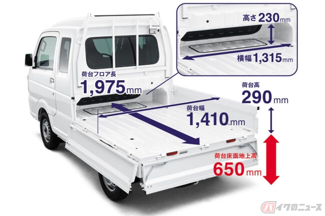 さて、ここで鋭い人はこう思うでしょう。「室内が広いということは荷台が狭いってことじゃね?」と。その通り。ニッポンの軽自動車はトラックだろうと、ワゴンだろうと、ハッチバックだろうと厳格にサイズが決まっています。例えば、全長3395mm・全幅1495mmというのがそれで、室内が広くなったからといって、その分を後方に伸ばすわけにはいきません。