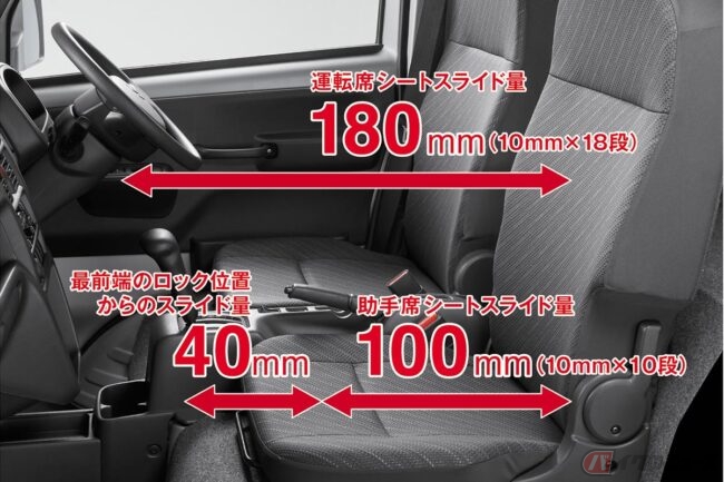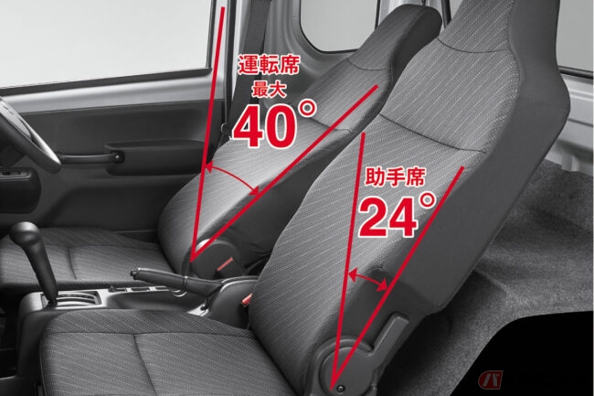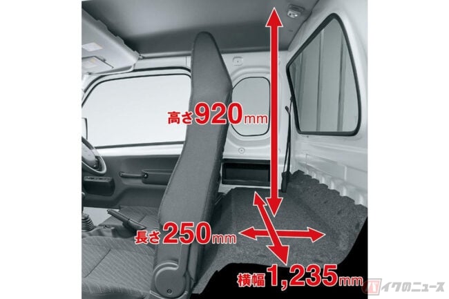 ところで、スーパーキャリイのなにがスーパーなのか? 「超運び屋」を名乗るからには、ウルトラハイスペックなところがあるわけで、それが運転席後方に設けられた収納スペースに他なりません。ほら、普通のKトラックって、シートが断崖絶壁のように切り立っていて、室内にはなにも置けないでしょ? スーパーキャリイにはその我慢が必要なく、極小空間の匠が手掛けたかのような隠し部屋が出現。シートを前方にパタンと倒す度に「なんということでしょう……」と、ひとりビフォア&アフターごっこができるのです。