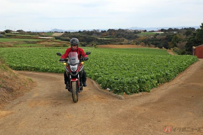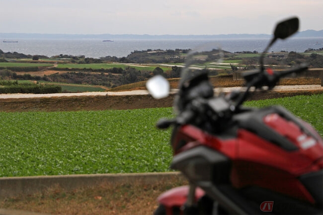 また、三浦半島らしい景色を求めて畑の中を巡る道を走っていると、ところどころでアスファルトの上に土が流出している場面があります。そんなときでもABSとトラクションコントロールがもたらす安心感で、心配せずに走ることができました。新型はスロットルバイワイヤーの採用や、DCTの設定も見直されているとのことで、さらに乗りやすくなっていることでしょう。