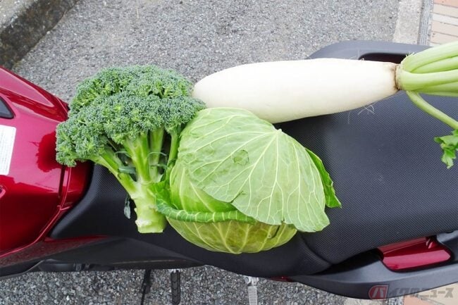 車体の特徴として忘れてはならないのが、エンジン上に配置されることが一般的な燃料タンク部分に設けられたラゲッジスペースです。スクーター以外でこれだけの収納スペースを確保しているバイクは稀有な存在です。「何を入れようかな?」と考えるだけでも楽しいもの。雨具や防寒具などを収納するのも良いですが、個人的にはあえてカラのままツーリングに出向き、お土産を詰めて帰ってくる、という使い方がオススメです。今回は三崎港にある産直品売り場「うらりマルシェ」で野菜を買い込み、わかってはいましたがかなりの量を収納出来てびっくりしました。新型ではさらに容量が拡大しているとのこと、ユーザーにとっては楽しも広がるのではないでしょうか。