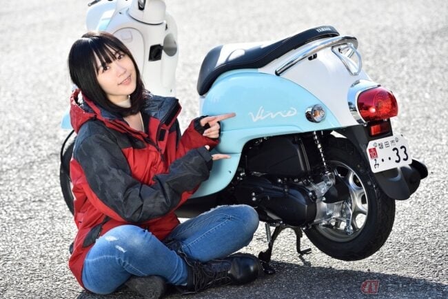 人気YouTuberで声優、モデルとして活躍する夜道雪さんが、人気マンガ「ゆるキャン△」に登場する50cc原付スクーターの「Vino(ビーノ)」のスペシャルカラーを試乗してみました。