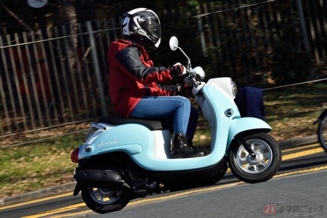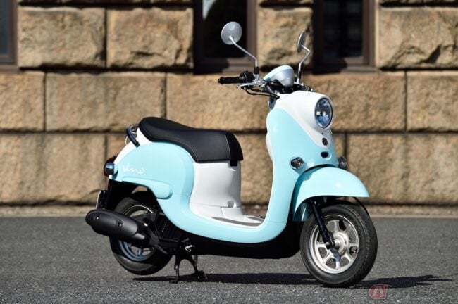 そこでヤマハのファッションスクーター「ビーノ」に試乗することに。レトロ感のあるデザインが人気の50cc原付スクーターで、1997年の登場から若い女性を中心に人気を集めてきたロングセラーモデルです。2018年にホンダに製造を移管されましたが、カウルマウントのフロントマスクは初代ビーノが登場から20年以上も受け継がれてきたデザイン。可愛らしさはそのままです。