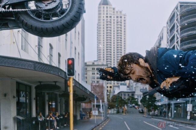 無数の弾丸が飛び交い、バイクが空を飛ぶ!