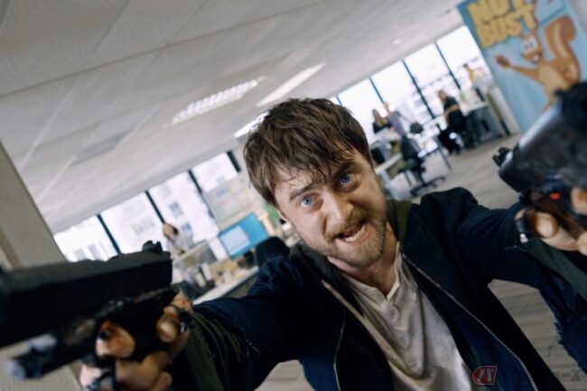 主演は『ハリー・ポッター』シリーズ以降、『スイス・アーミー・マン』(2016年)の腐りかけの死体役など、様々な役柄に挑戦するダニエル・ラドクリフ。両手に拳銃を固定されてしまうマイルズを熱演しています。