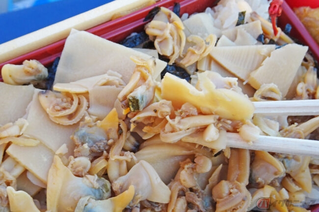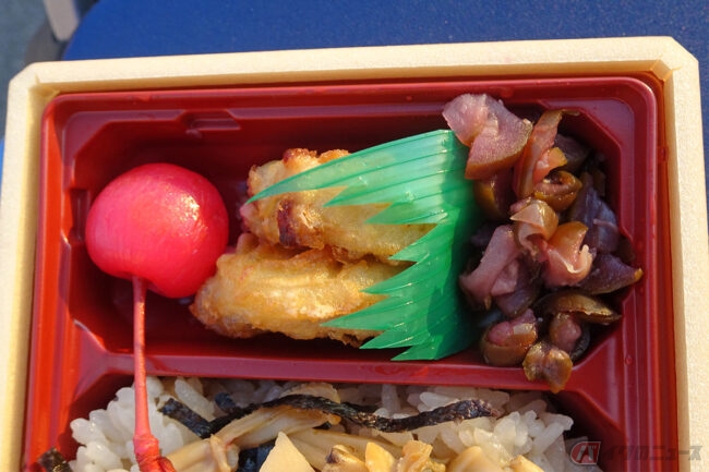 ふっくらと炊きあげられたあさりは、柔らかくて風味も抜群。大ぶりにカットされたたけのこの食感もよく、ご飯の上に敷き詰められたのりの香りとの相乗効果で「海」を感じられる味わいです。食材のジューシーさは、ご当地弁当ならではかもしれません。