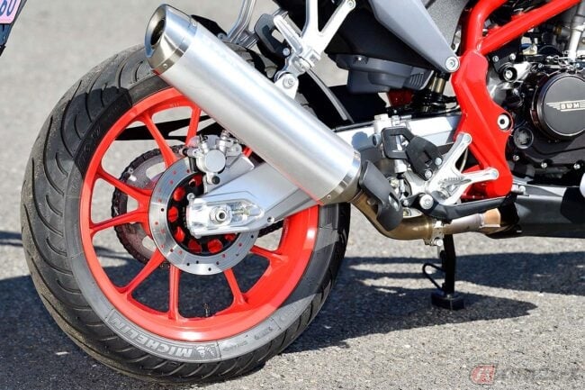 その筆頭が、手の込んだ車体でしょう。メインフレームはいくつものパイプ径から成るトレリス構造で組まれ、スイングアームの素材はスチールではなくアルミ鋳造を採用。これだけでコスト優先のモデルではないことが分かります。