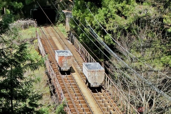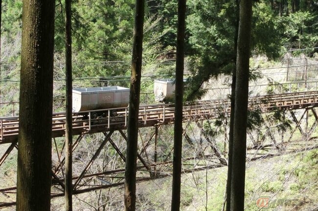 すると、杉林の向こうから「ガタガタガタ……」という断続的な金属音が聞こえてきました。と、次の瞬間、ガタゴトと鉄橋を渡る無人のトロッコが木々の間から見えたのです。どうやらここは、先ほどバイクで下から見上げた鉄橋と同じ場所のようです。
