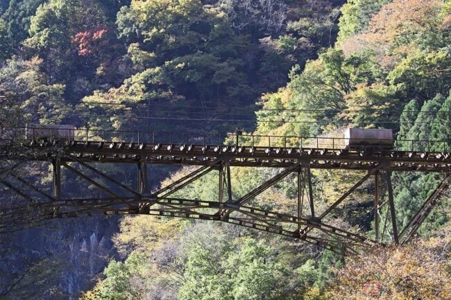 この線路を調べてみると「奥多摩工業曳鉄線(おくたまこうぎょうひきがねせん)」という路線で、奥多摩工業という石灰石を採掘・加工販売する会社のもの。採掘場である氷川(ひかわ)鉱業所のある日原地区から、加工場のある奥多摩駅近くまで約5kmを結んでいます。ほとんどが山中のトンネルで、一部鉄橋部分のみ見ることができるそうで、この鉄橋はそのレアな場所のひとつなんですね。