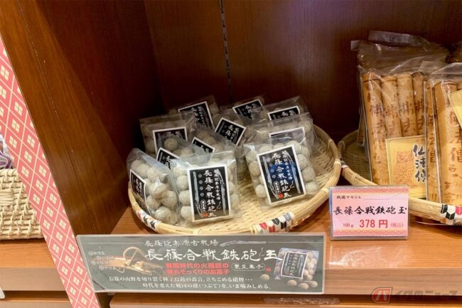 ショッピングコーナー「戦国マルシェ」にも古戦場をイメージした商品がたくさんあります。長篠と言えば鉄砲ということで、その名もズバリな「長篠合戦鉄砲玉」という黒豆菓子を購入。戦国の世を思い浮かべながら、ツーリング途中に立ち寄ってみるのはいかがでしょうか。