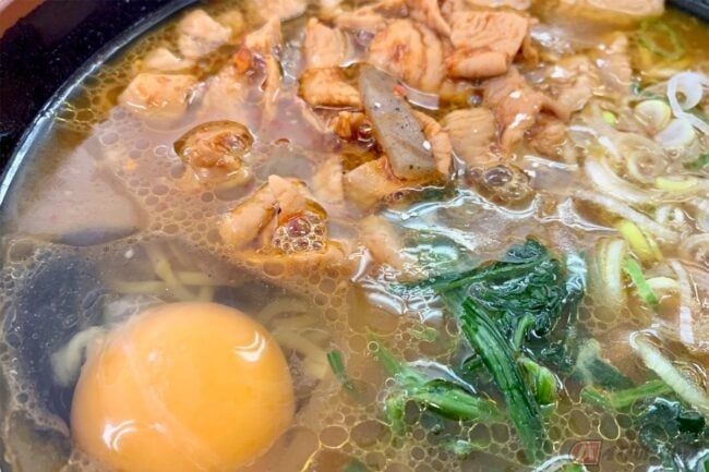 醤油とんこつ出汁のスープに、辛味の効いたもつ煮がどっさりと入っていて、見た目だけでテンションが上がります。しかも生卵付き。身体が温まるだけでなく体力回復にも効果がありそうなので、ますますライダーにピッタリなPA飯と言えるでしょう。