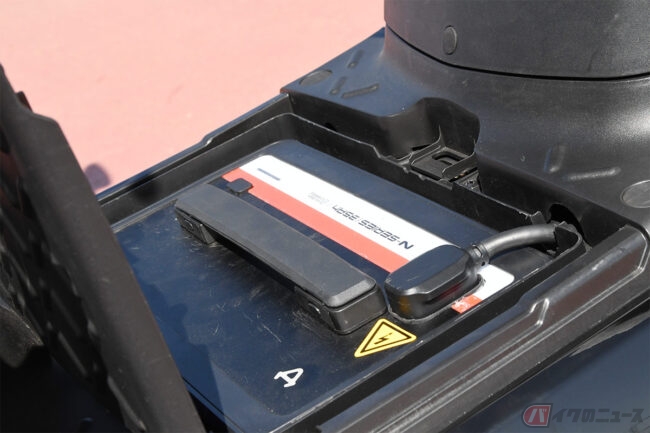 「NQi GT」にはシート下に1個、フラットなステップボードの下に1個、合計2個のバッテリーが収納されており、シート下のバッテリーを外した状態でも走行が可能です。その場合、3つある走行モード(SPORT、DYNAMIC、E-SAVE)のうち、SPORTモードが選択不可になります。