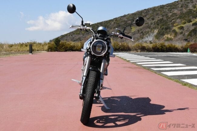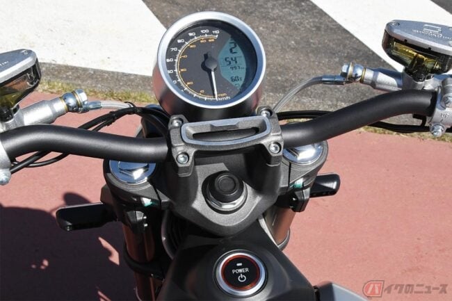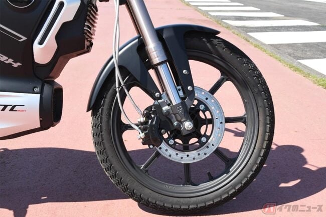 外観はネオレトロといった印象です。横から見るとバッテリーやモーターを搭載する車体の中心部にボリュームを感じますが、横幅はすっきりとしています。定格出力3900W、定格容量3240Wh(72V45A)のバッテリーは、内燃機関のバイクで言う燃料タンク部分に収納されています。