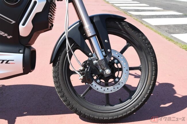 サスペンションの動きもよく、40kgの体重でも停止状態でまたがると沈み込みを感じることができました。また、内燃機関のバイクのようにエンジンを搭載していないため、車体がスリムで足を地面へ下ろしたときに干渉する部分が少なく、これも足つき性の良さに貢献しています。小柄なライダーにとって、足つき性は大きなチェックポイント、「TC MAX」はなかなかの好印象でした。