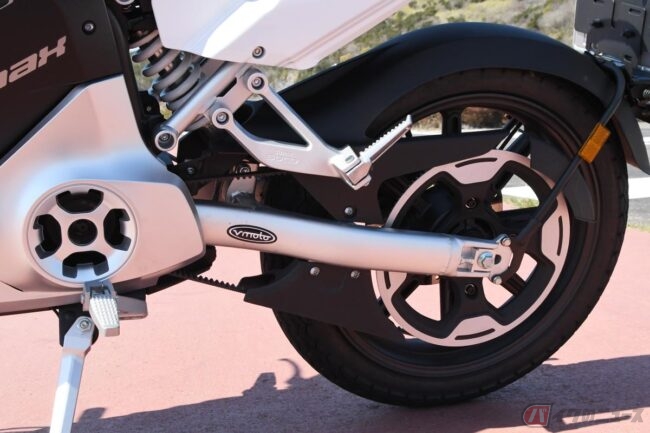 重量物であるバッテリーとモーターは、車体のほぼ中心部に集められています。車体を起こす、寝かせるという動きの中で、この重さを感じることになりました。車体重量約103.5kgを考えれば「もっとヒラヒラと動いてもよさそうなのに……」と走りながら疑問に感じたほど。