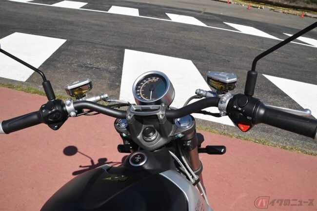 あえて違和感を挙げるならば、ブレーキ時の感覚です。SUPER SOCOは回生ブレーキのない電動バイクになっています。このため、スロットルを戻してもエンジンブレーキに相当する減速が得られません。そのスピードを保ったままブレーキをかけていきます。4ストロークの内燃機関のバイクに慣れている筆者にとって、この感覚は斬新でした。
