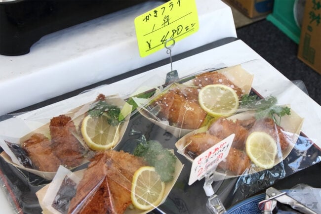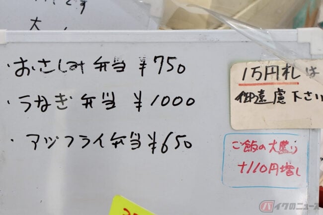 さて、そんな魚平商店の一番人気メニューはというと、新鮮な刺身が山盛りの「刺身弁当」です。他にもアジやカキなどのフライも販売しています。ライダーのほとんどは、刺身弁当や日替わり弁当にフライをトッピングしています。筆者(増井貴光)が訪問した日はちょうどアジフライ弁当も販売していたので迷わず購入しました。そこへ更にアジフライをトッピングし、ダブルアジフライ弁当にしていただきました。