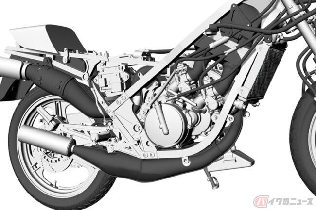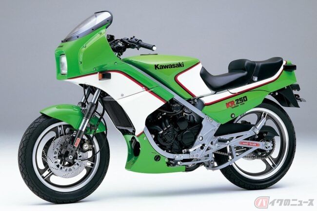 1970年代末から1980年代初頭に無敵を誇ったWGPレーサー「KR250」から、そのメカニズムと名前を継承した市販車「KR250」(1984年)は、シリンダーを前後に配置する、タンデムツイン形式のエンジンを搭載しています。
