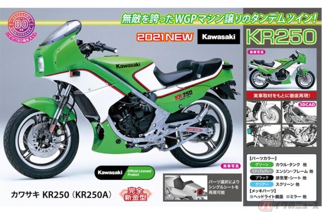日本の老舗プラモデルメーカー『ハセガワ』から、1984年に登場したカワサキ初の2ストロークレーサーレプリカ「KR250」の1/12スケールのプラモデルが発売されます。