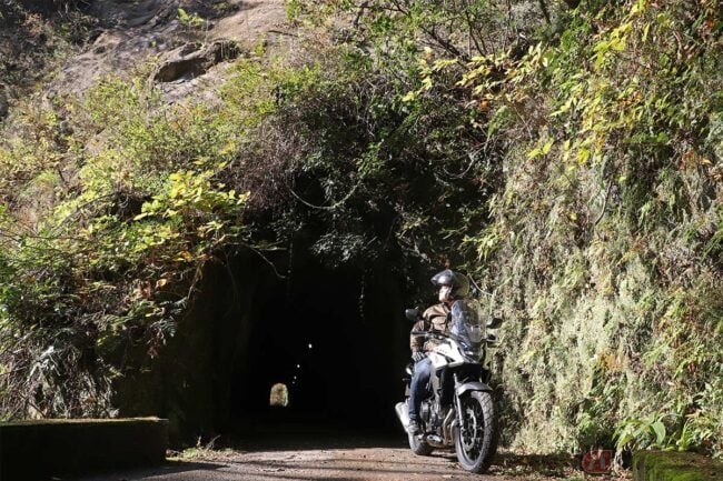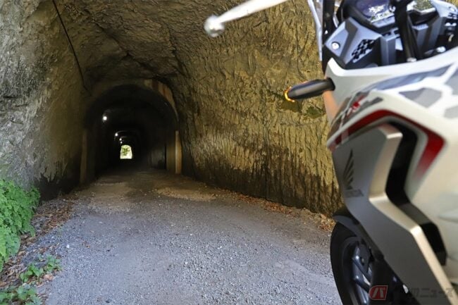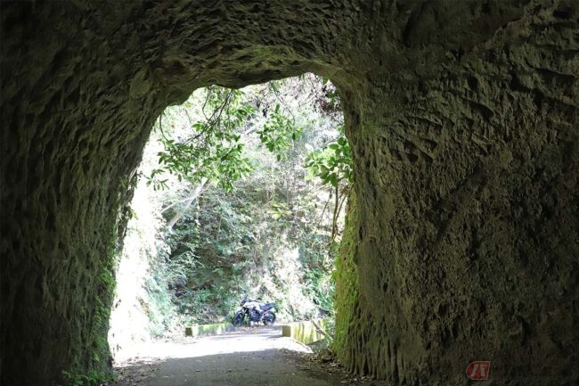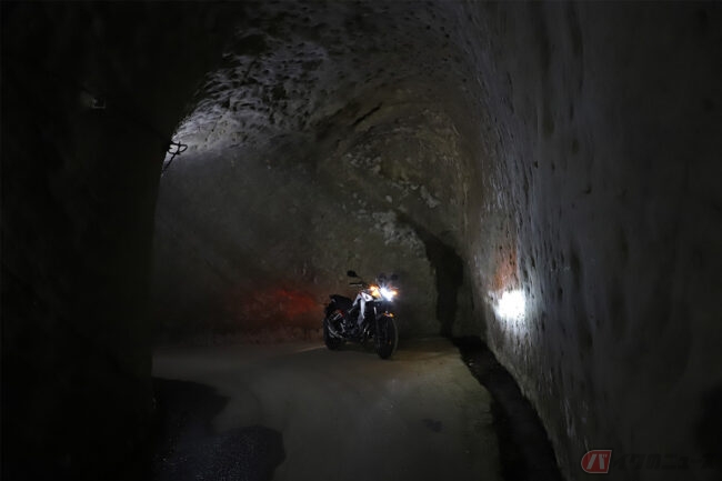 内部は照明がほとんどなく、ヘッドライトの明かりだけが頼りです。出口が見えないな……と思ったら、いきなりほぼ直角に曲がっていました。道幅はバイクでもすんなりと曲がれないほど細く、うかつにクルマで乗り入れると大変なことになりそうです。