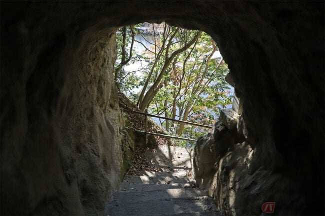 横穴の先は湖に抜けており、階段の先には小さな社がありました(八雲神社というそうです)。L字の次には横穴、その先には絶壁にへばりつくように存在する秘密めいた社……ここはまるでテーマパークのような、ドキドキが連続するトンネルでした。