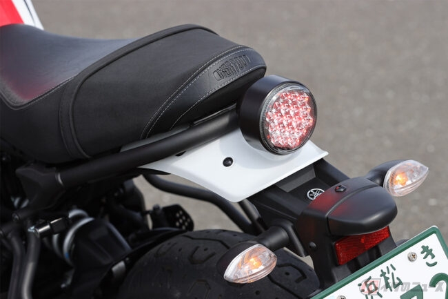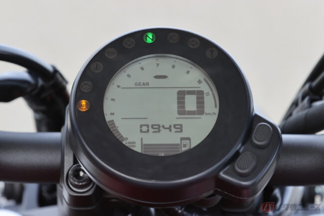 また、ヘッドライト、テールライト、メーター、マフラーエンドなど印象的な丸モチーフを使うことで、ソコハカとなく70年代を香らせておいて、デジタル表示のメーターパネルやテールランプにLED光源を使うなど、表現される時代性はまさに今です。