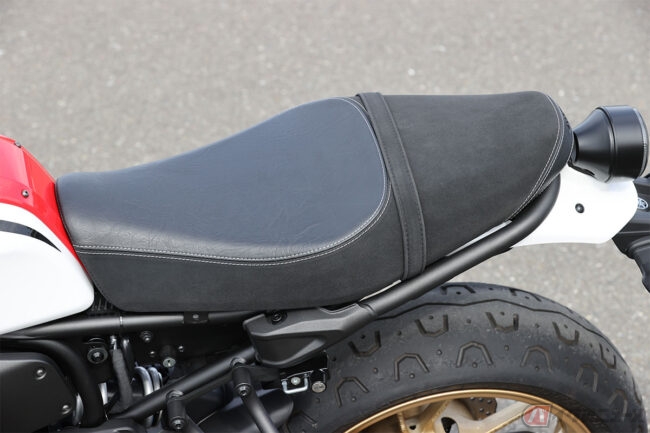 しかし、開発ストーリーを見れば昔を懐かしむモデルではなく、必要なパーツがあるべき姿でデザインされていること、それをオーセンティック(正統派の、本格的な、などの意)としてデザインされたモデルであり、レトロモダンという時代的な感情は介入させていない、とキッパリ表現されています。カラーリングが往年のロードレースのヤマハファクトリーマシンに採用されていた赤/白/ゴールドだからといって時代もの、ではないのです。