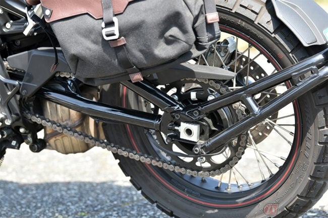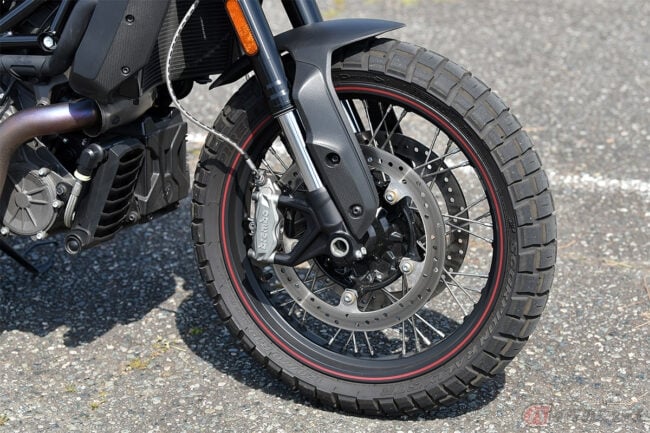 タイヤには、ピレリ製のスコーピオンラリーSTRというブロックタイヤが標準装着されています。そのパターンはオフロード走行ありきかと思いきや、見た目とは裏腹にオンロードでもまったく違和感がないほどグリップ。かなりバンクさせても腰砕けになるような気配はなく、スポーティなコーナリングを実現しています。