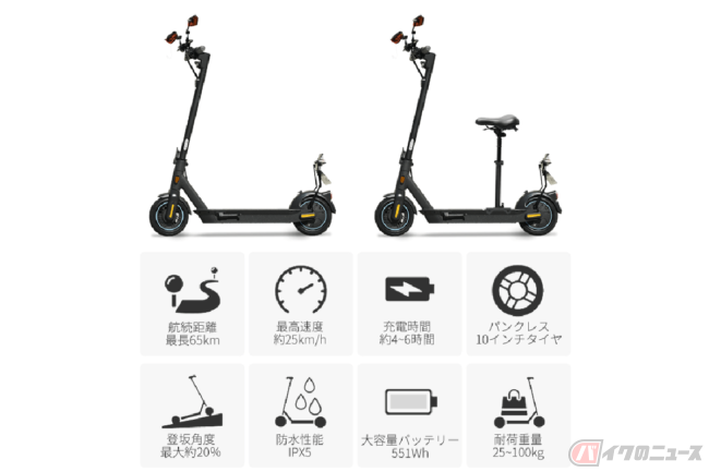 過去に画期的な立ち乗りモビリティ「i2」などを発売し、知名度を高めたセグウェイ(2015年に新興輸送ロボット企業Ninebot Inc.が買収し、社名変更)の日本向けモデルJ-MAXは、約4~6時間の充電で最長65kmの航続が可能な電動キックボードです。