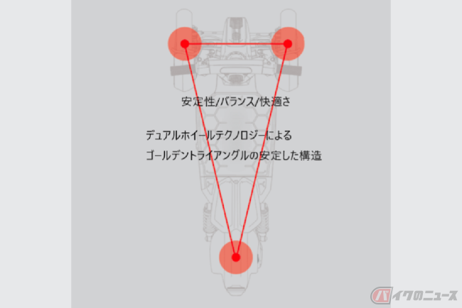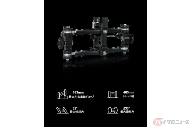 最大傾斜角32°、最大左右車輪ドロップ163mmを実現するゴールドトライアングル構造をフロント周りに採用することで、安定したコーナリングと路面追従性を追求したilarkは、単独での倒立も可能でスタンド無しでの駐車が可能となっています。