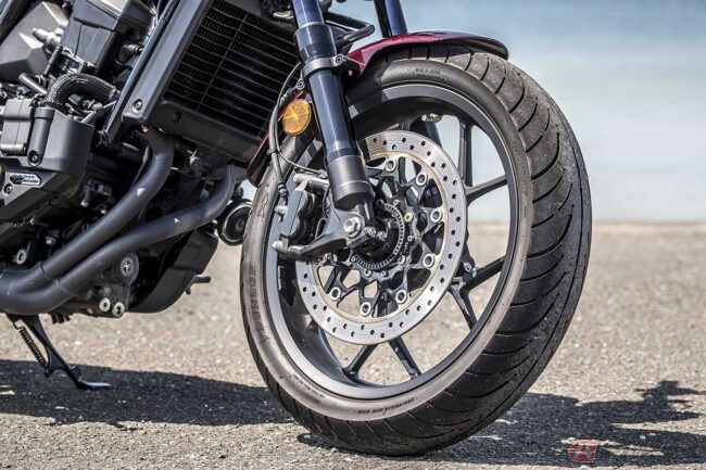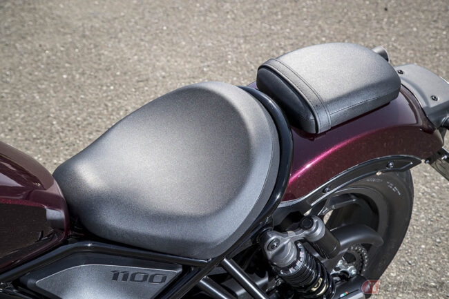 ちなみにレブル1100には水冷4ストロークOHC4バルブ直列2気筒の1082ccエンジンが搭載されているのですが、その乗り味はというとフラットでトルクフル。ハーレーのような“ドドド感”こそないのですが、下から“ググッ”とトルクを感じる走り出しは、コレはコレで楽しいものです。そのフィーリングをあえて悪く言えば「ギクシャク」という表現になってしまうのかもしれませんが、“アメリカン・クルーザー”なら、これくらい荒っぽいエンジン・フィーリングの方が車体のコンセプトにマッチしているでしょう。